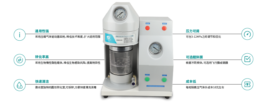 ? 通用性強(qiáng) 采用壓縮氣體驅(qū)動基因槍,降低技術(shù)難度,擴(kuò)大適用范圍